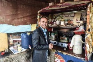 هاني السالمي؛ أديب فلسطيني، عُمره أربعون عاماً، متزوج ورزقه الله أربع بنات، يعمل بائع قهوة على رصيف في مدينة “خان يونس” بقطاع غزة، عمل قبل استقراره في “بسطة القهوة” حمّالا ودهاناً وأعمالا أخرى ليعيل أسرته وليواصل القراءة والكتابة، فقد سُدت الأبواب كلها التي طرقها على أمل الحصول على عمل يليق بمكانته الأدبية والثقافية وفشل، لكنه لم ييأس، تمرّد على الواقع، وقرر قبل عام نقل أواني المطبخ الخاصة ببيته وكرسيين وغاز الطهي الصغير ليبدأ في بيع القهوة.