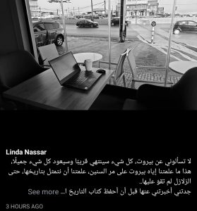 لا تسألوني عن بيروت، كل شيء سينتهي قريبًا وسيعود كل شيء جميلًا، هذا ما علمتنا إياه بيروت على مر السنين، علمتنا أن نتمثل بتاريخها، حتى الزلازل لم تقوَ عليها..