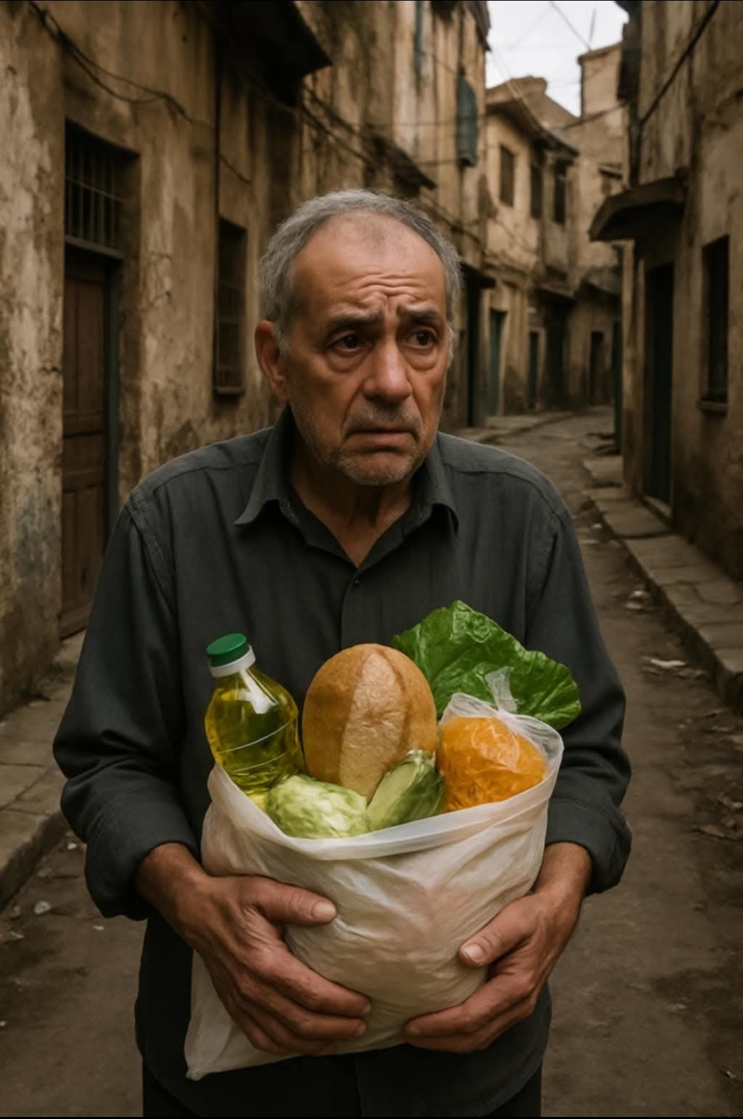 كان الرجل الطيب يمشي مع الموكب بكل قلق ، ممسكا بكيس المواد الغدائية بكل حرص ، بإعتباره دليل براءته الوحيد حسب ما يظن … فعلا الرجل أثار إنتباه الجماهير .
